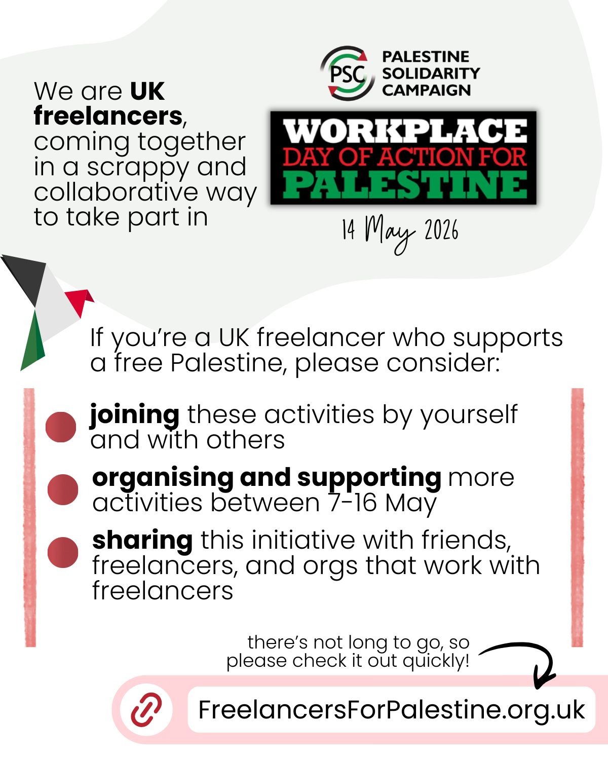 We want you to share this far and wide, as quickly as possible, so that anyone can contribute to organising, and all UK freelancers have a chance to join in with Workplace Day of Action for Palestine.